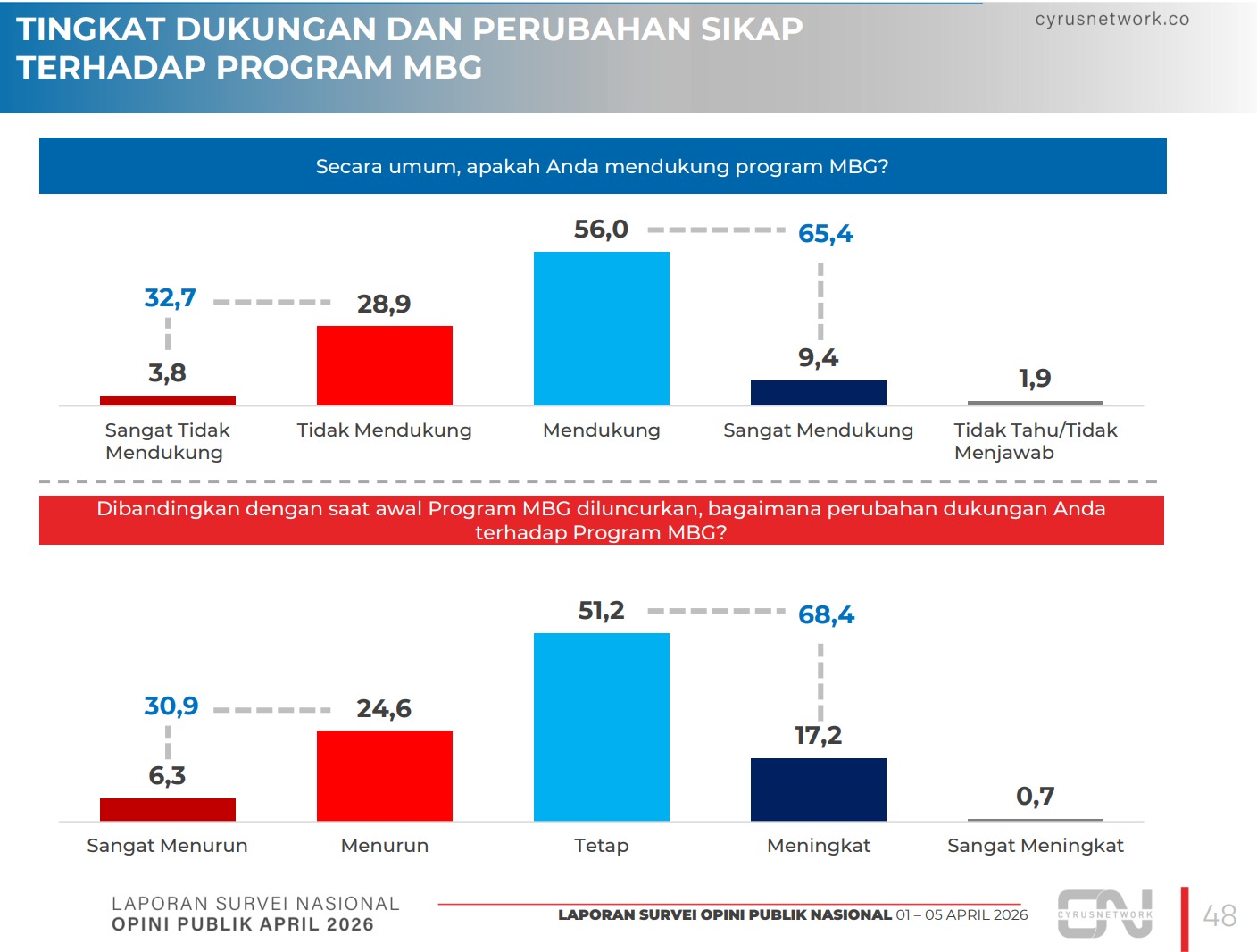 “Hasil survei menunjukkan 65,4 persen publik mendukung program MBG. Sementara itu, yang tidak mendukung sebesar 32,7 persen. Artinya, jumlah masyarakat yang mendukung jauh lebih besar,” ujar Syahril dalam konferensi pers daring, Selasa, 14 April 2026.
