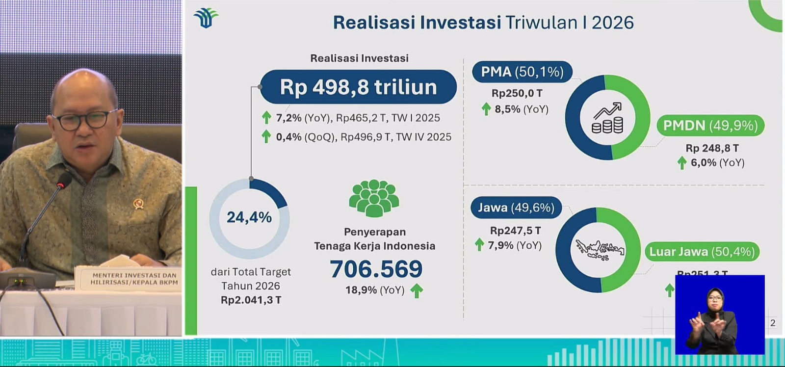 Realisasi investasi Indonesia pada kuartal pertama tercatat mencapai Rp498,8 triliun, menandai pertumbuhan sebesar 7,2 persen dibandingkan periode yang sama pada tahun sebelumnya.