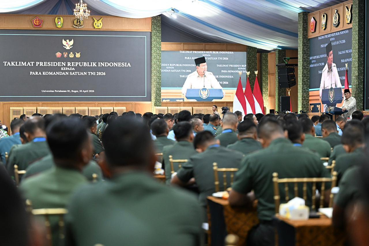 Presiden Prabowo Subianto memberikan arahan strategis dalam taklimat kepada para Komandan Satuan (Dansat) TNI Tahun 2026 yang berlangsung di Universitas Pertahanan, Kabupaten Bogor, Jawa Barat, Kamis 30 April 2026.