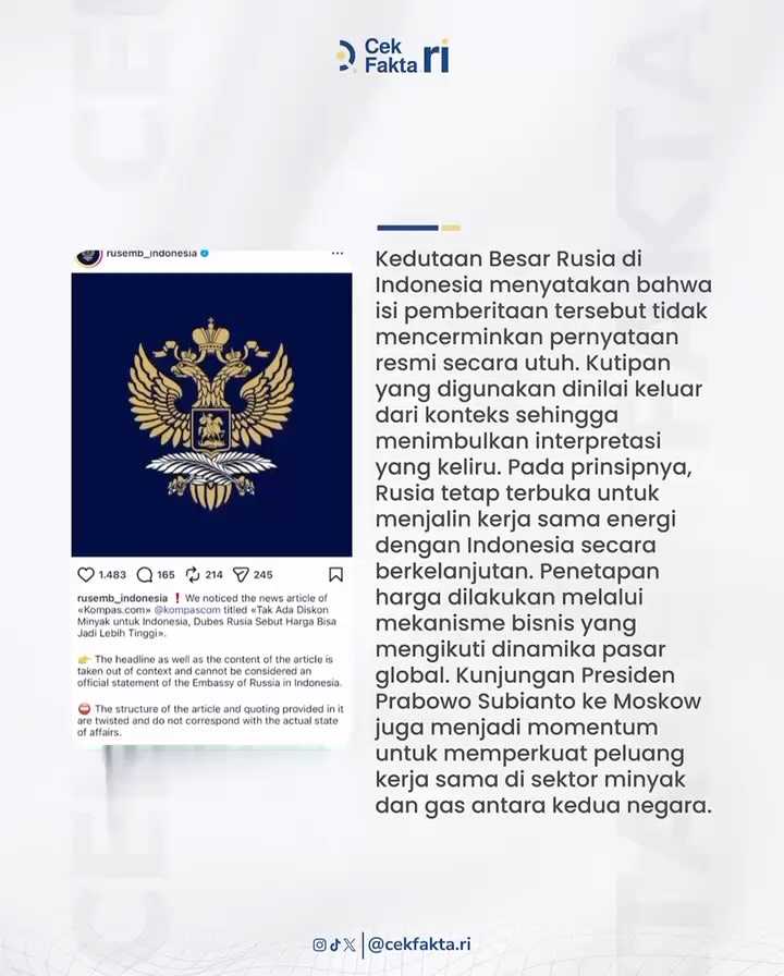"Pada prinsipnya, Rusia tetap terbuka untuk menjalin kerja sama energi dengan Indonesia secara berkelanjutan. Penetapan harga dilakukan melalui mekanisme bisnis yang mengikuti dinamika pasar global," demikian keterangan akun Instagram Cek Fakta RI, dikutip pada Minggu, 19 April 2026.