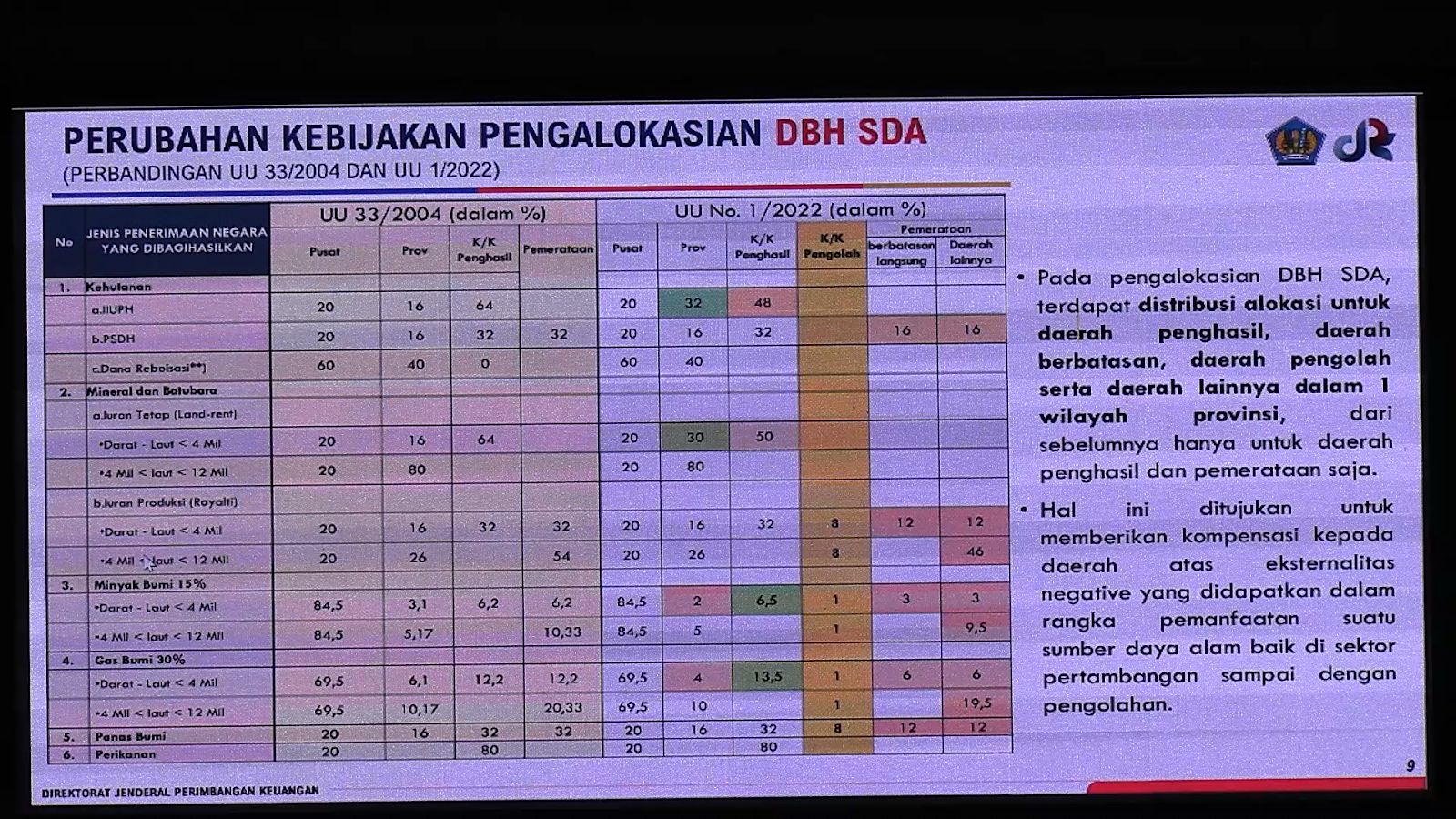 Direktur Dana Transfer Umum Kementerian Keuangan, Sandy Firdaus, menjelaskan bahwa DBH merupakan salah satu instrumen transfer ke daerah yang bersumber dari Penerimaan Negara Bukan Pajak (PNBP), termasuk dari sektor royalti pertambangan.