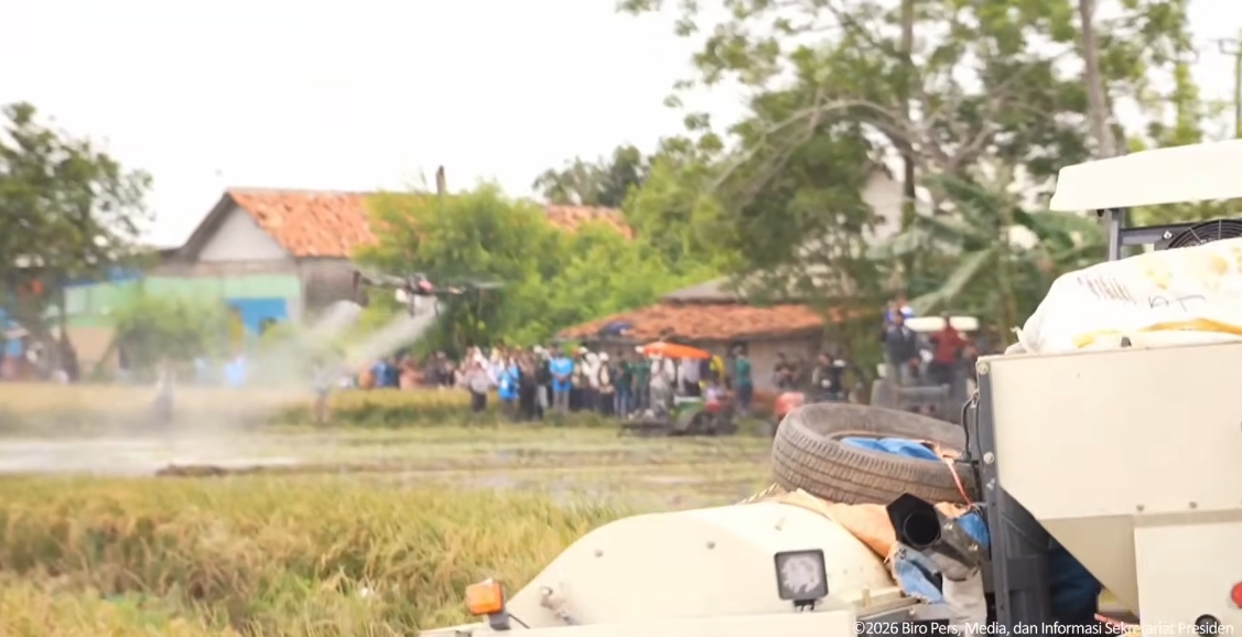 Dalam peninjauan langsung di lokasi panen raya, Presiden mengamati implementasi teknologi sektor agraria, mulai dari penggunaan drone pemantau lahan hingga alat mesin pertanian (alsintan) otomatis.