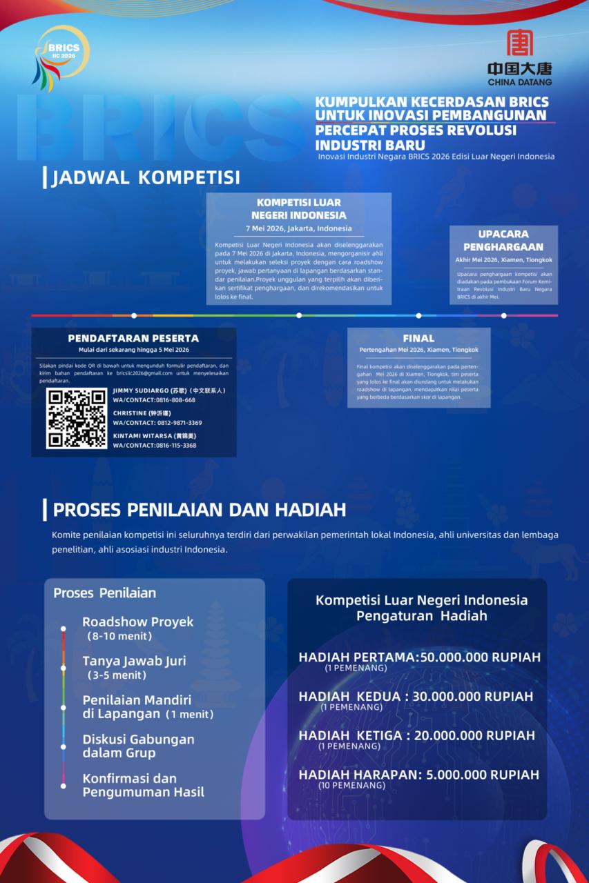 Pendaftaran dibuka hingga 5 Mei 2026 pukul 23.59 WIB. Kompetisi ini diharapkan menjadi katalis pertumbuhan ekonomi berbasis inovasi di Indonesia, sekaligus memperkuat kolaborasi strategis antara Indonesia, China, dan negara BRICS dalam menciptakan industri masa depan yang berdaya saing tinggi.