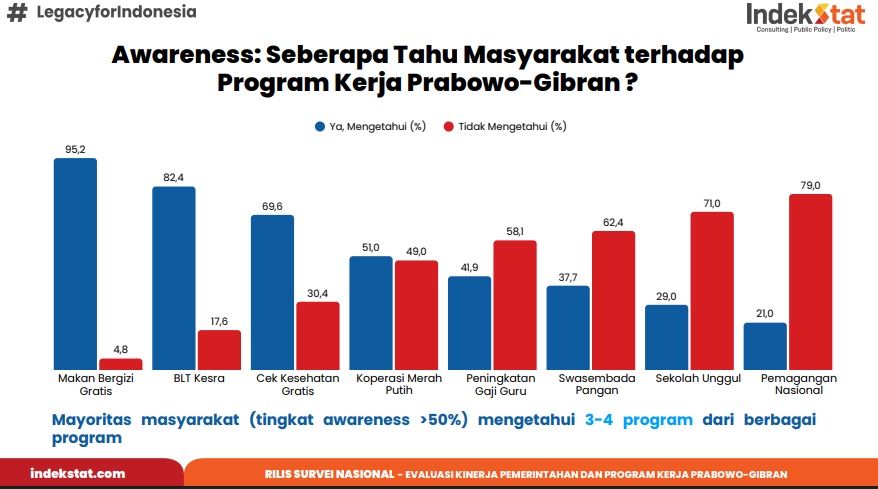 Berdasarkan survei nasional terbaru yang dirilis oleh Indekstat Konsultan Indonesia, Sabtu 21 Februari 2026, sebanyak 79,2 persen responden menyatakan puas terhadap kinerja kabinet saat ini.