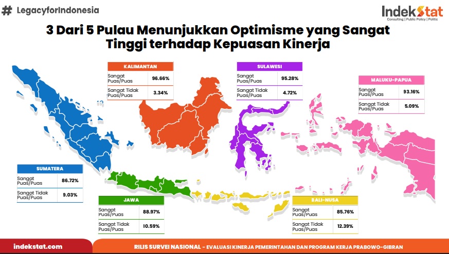 Pulau Kalimantan memimpin dengan angka kepuasan 96,66 persen, diikuti oleh Sulawesi (95,28 persen), serta Maluku dan Papua (93,16 persen).
