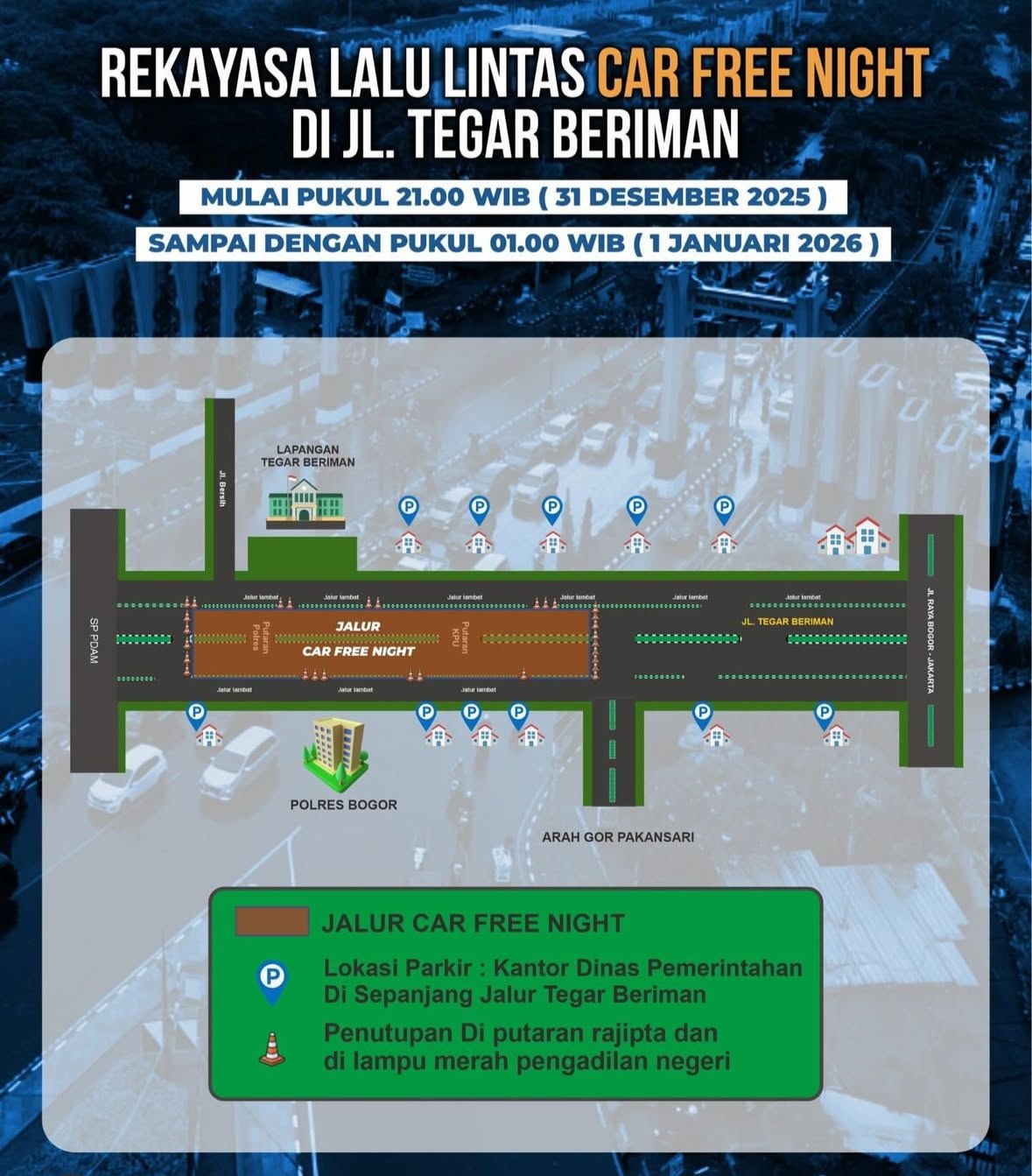 Satuan Lalu Lintas Polres Bogor akan memberlakukan sejumlah rekayasa lalu lintas dan Car Free Night (CFN) di beberapa titik strategis Kabupaten Bogor guna mengantisipasi lonjakan kendaraan dan kerumunan masyarakat pada malam pergantian Tahun Baru 2025/2026.