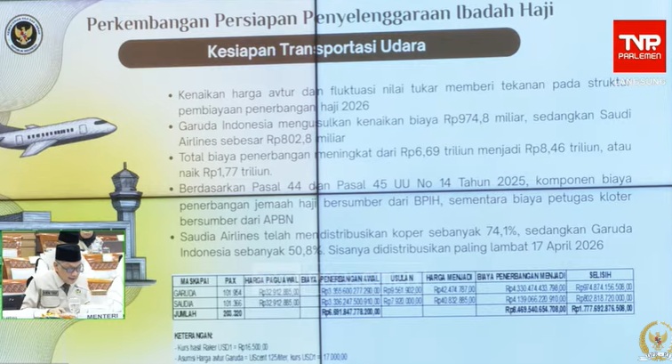 Menteri Haji dan Umrah, Mochamad Irfan Yusuf, secara resmi mengajukan penambahan anggaran sebesar Rp1,77 triliun kepada Komisi VIII DPR RI guna menutup selisih biaya yang dipicu oleh kenaikan harga bahan bakar pesawat (avtur).