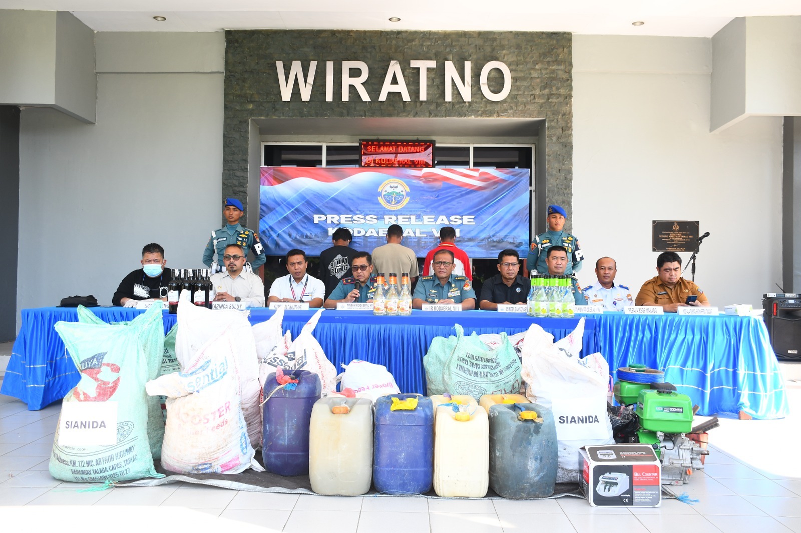 “Setelah berhasil dihentikan, ditemukan 1 orang nakhoda dan 2 orang ABK di atas kapal yang memuat barang berbahaya berupa sianida (CN) serta minuman keras illegal,” ujar Wadan Kodaeral VIII dalam konferensi pers di Joglo Kodaeral VIII, Senin 2 Februari 2026.