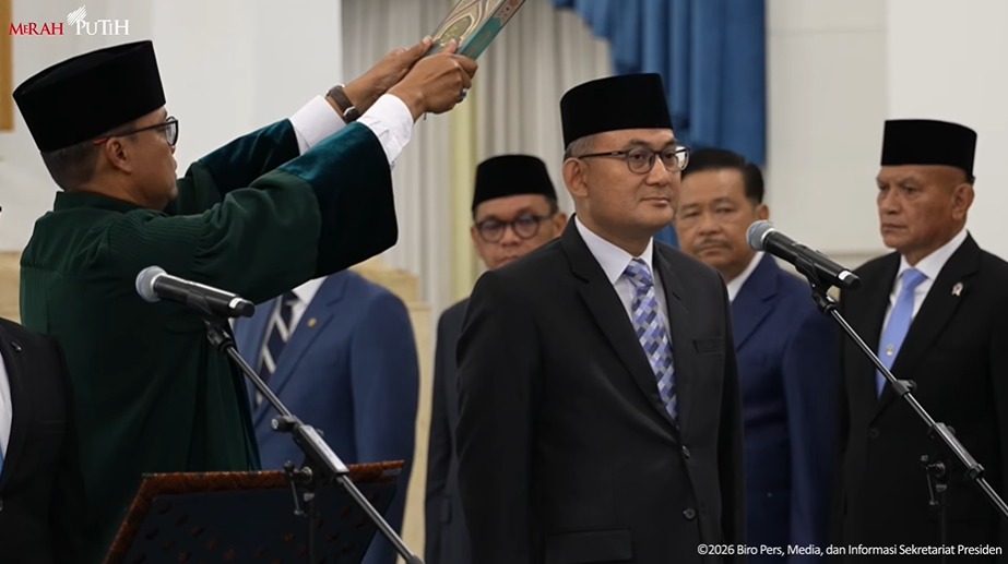 "Bahwa saya dalam menjalankan tugas dan jabatan akan menjunjung tinggi etika jabatan, bekerja dengan sebaik-baiknya dengan penuh rasa tanggung jawab," ucap Andi Rahadian mengikuti tuntunan sumpah Presiden.