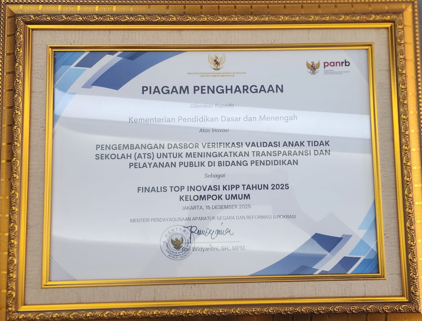Inovasi peranti lunak Dasbor Anak Tidak Sekolah (ATS) yang dikembangkan Pusat Data dan Teknologi Informasi (Pusdatin) Kementerian Pendidikan Dasar dan Menengah (Kemendikdasmen) berhasil menembus jajaran finalis Top Inovasi Kompetisi Inovasi Pelayanan Publik (KIPP) Tahun 2025 yang diselenggarakan Kementerian Pendayagunaan Aparatur Negara dan Reformasi Birokrasi.
