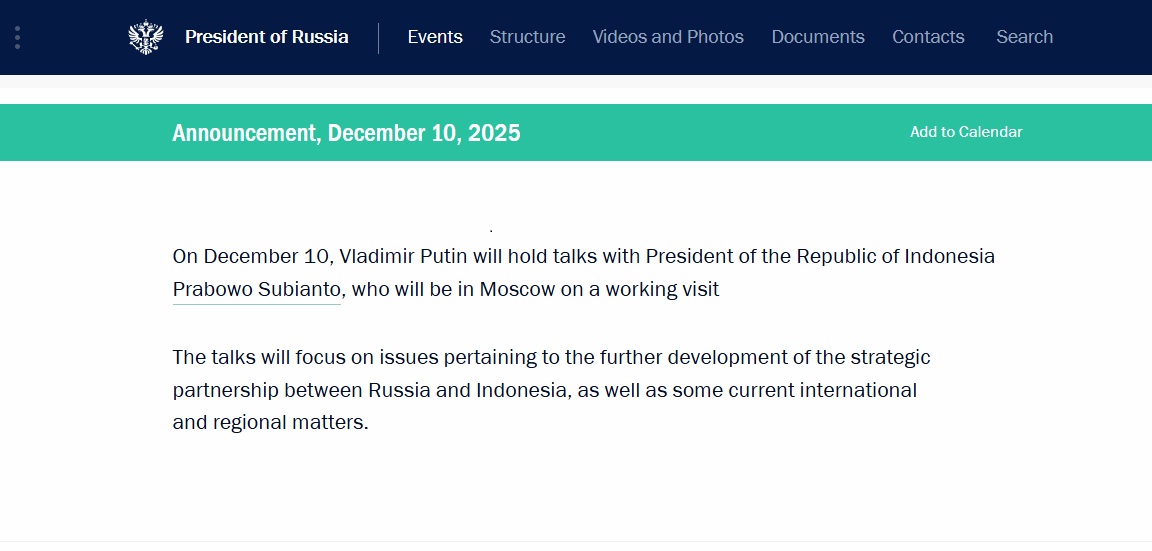 "Pembicaraan tersebut akan berfokus pada isu-isu terkait pengembangan lebih lanjut kemitraan strategis antara Rusia dan Indonesia, serta beberapa isu internasional dan regional terkini," demikian bunyi pernyataan yang dirilis Kremlin, seperti dikutip pada hari Rabu 10 Desember 2025.