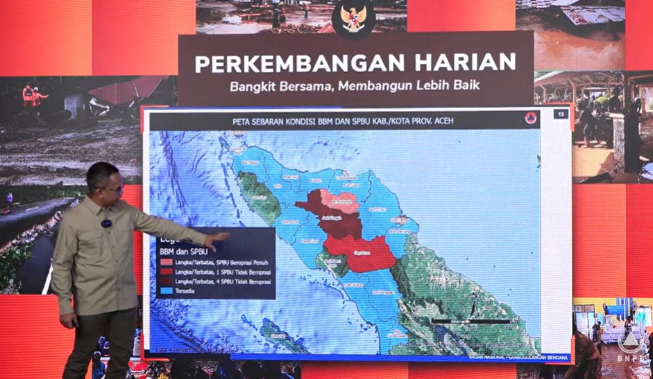 Kepala Pusat Data, Informasi, dan Komunikasi Kebencanaan BNPB Abdul Muhari mengatakan, di Provinsi Aceh, khususnya kawasan pesisir timur dan pesisir barat, seluruh SPBU telah kembali beroperasi dan distribusi BBM berjalan normal.