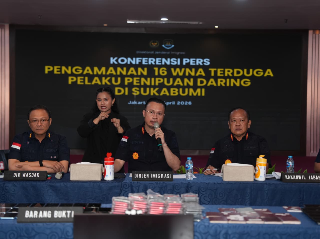 Kantor Imigrasi Sukabumi mengamankan 16 warga negara asing (WNA) yang diduga terlibat dalam praktik penipuan daring (online scam) bermodus love scamming di kawasan Pelabuhan Ratu, Kabupaten Sukabumi, Jawa Barat, pada 14 April 2026.